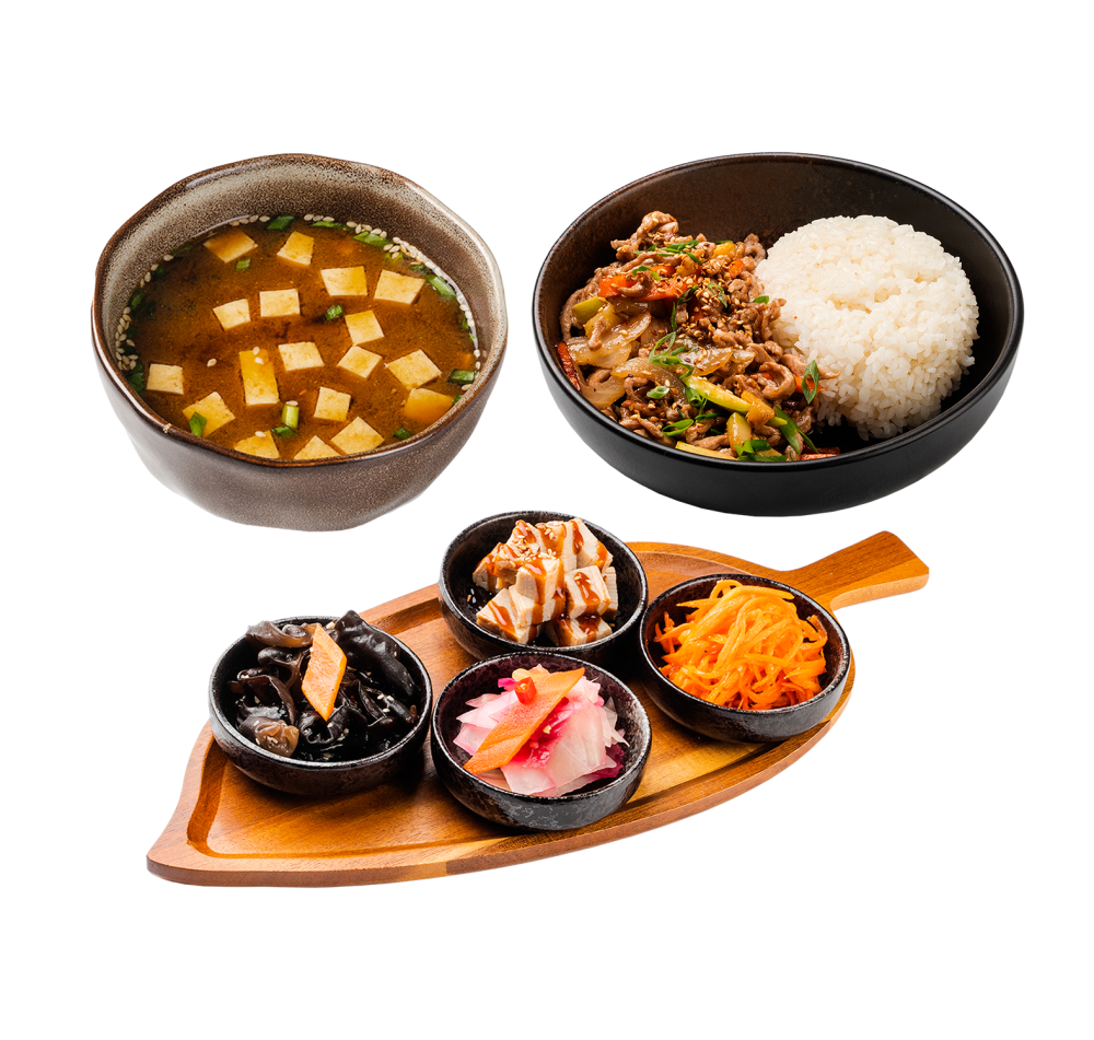 Чеджу ланч - Мясо с овощами на рисе - Панчан-сет «Сеул» - Мисо-суп