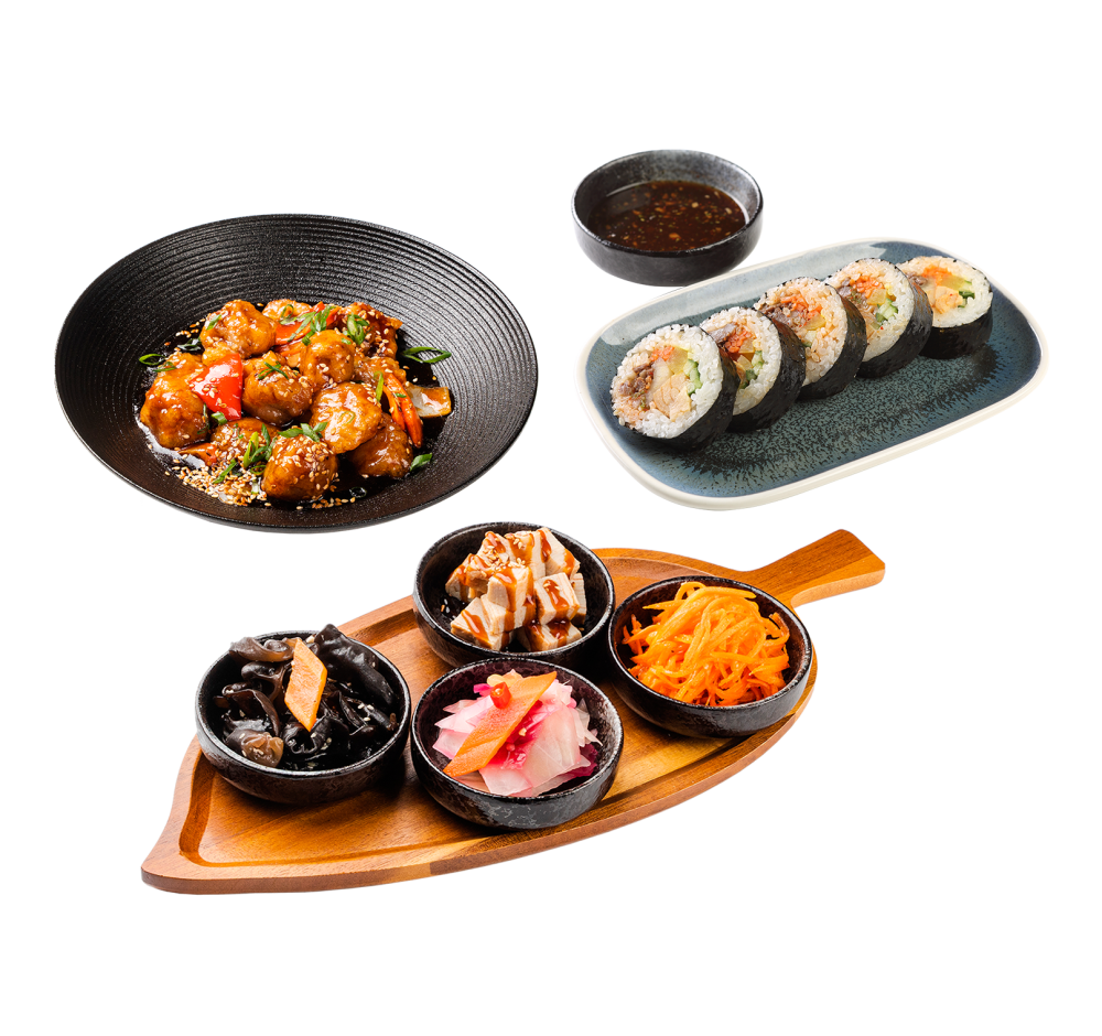 Тэгу комбо - Мясо по-пекински - Панчан-сет «Сеул» - Кимпап с курицей (1/2)
